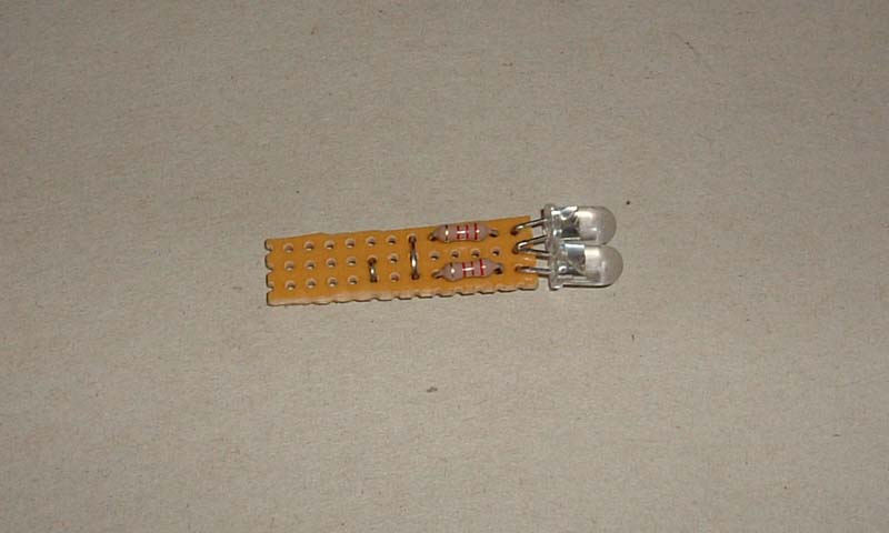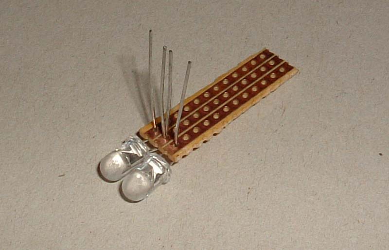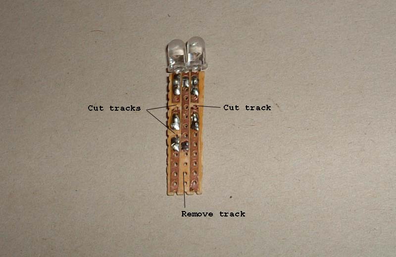 them to the strip board as shown, with both cathode (negative) leads in the